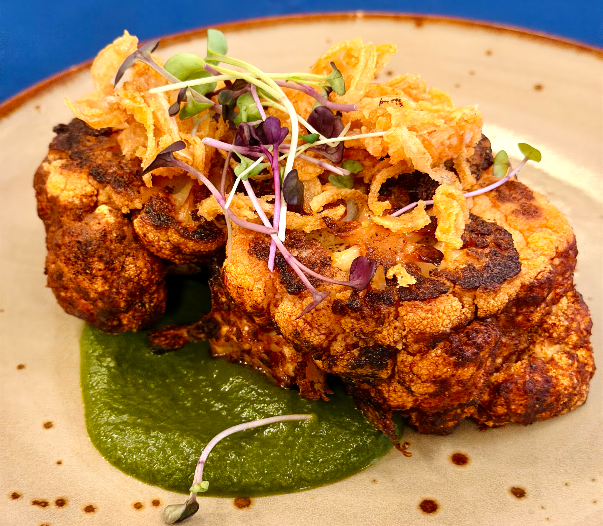 CAULIFLOWER | roasted, aubergine, avocado, quinoa tuile, paprika & lime oil by Luc | $26